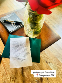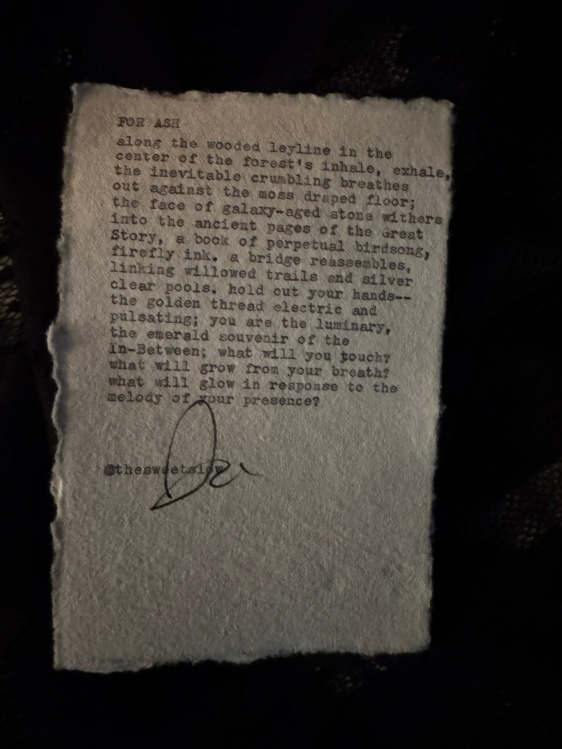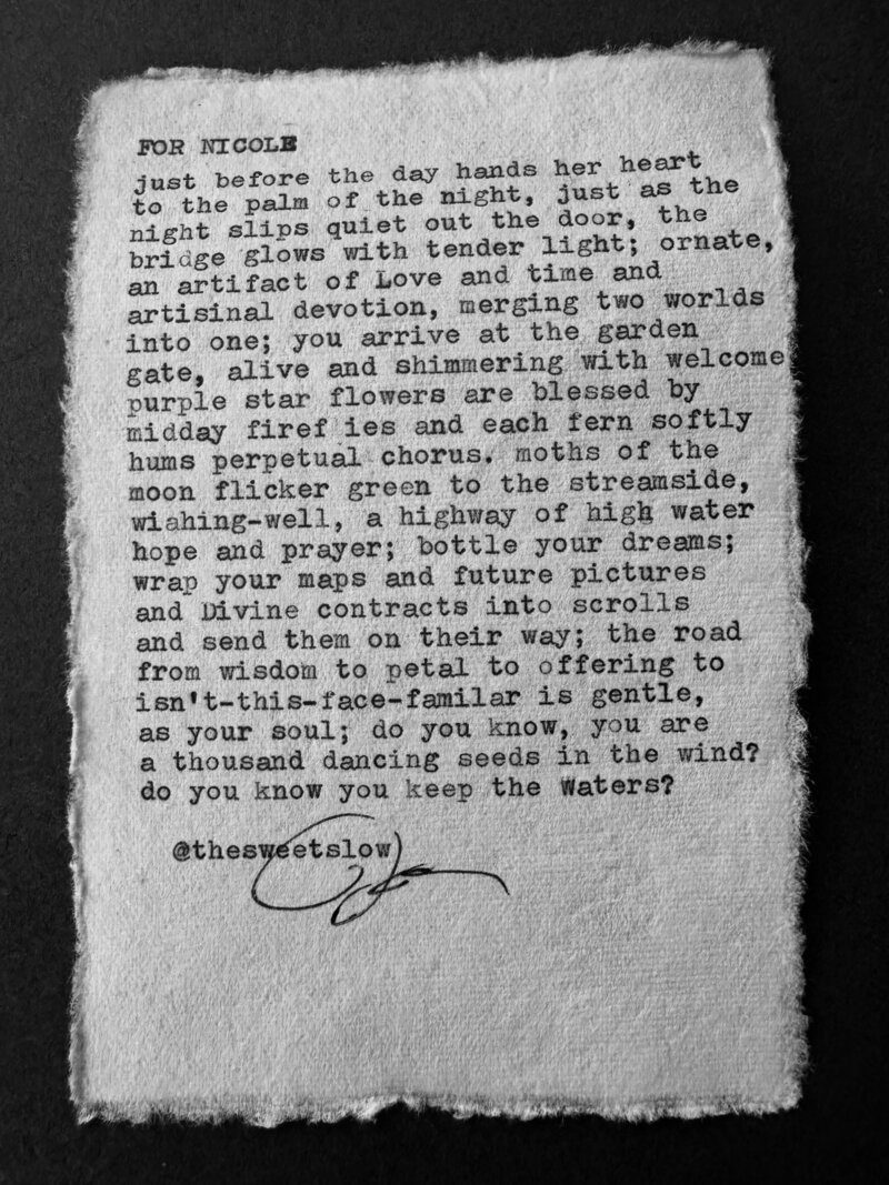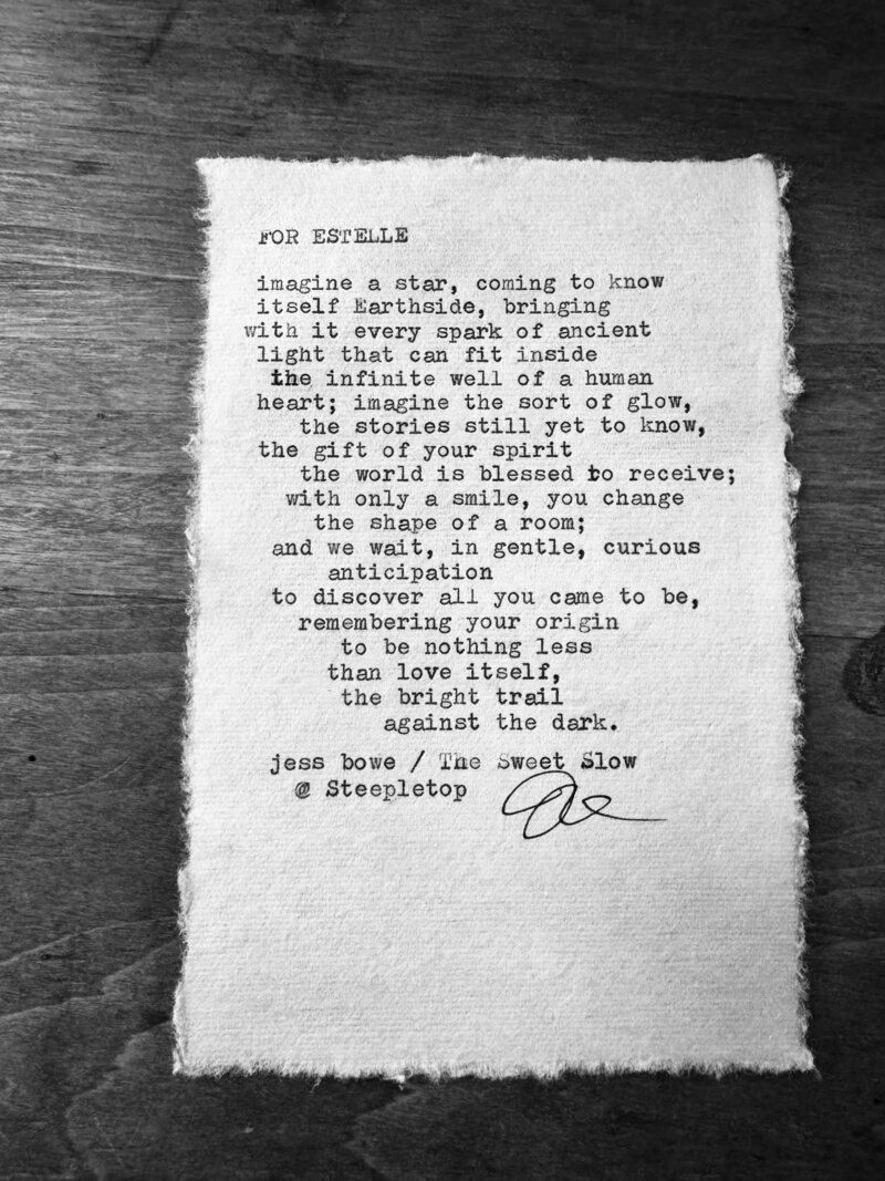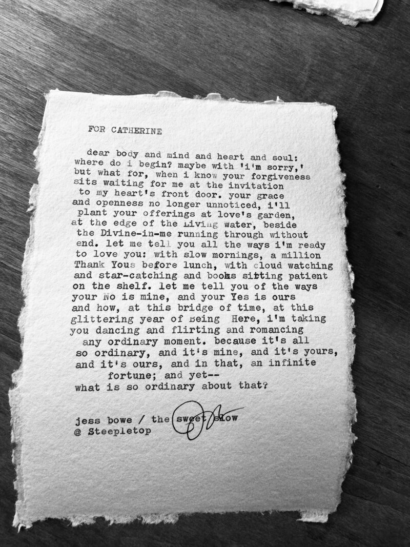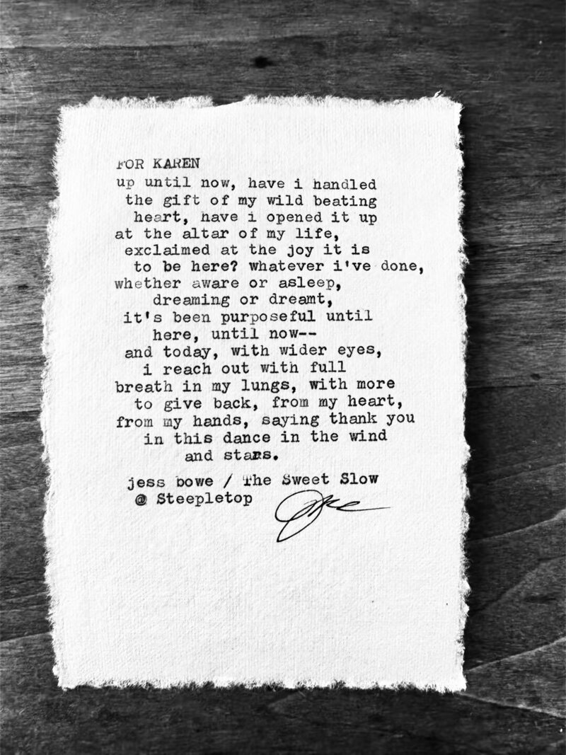 what else do i love? talking to you. listening to your stories. watching your eyes spark when you speak of your joy. sharing your grief, for a moment. then.. bringing the heart of it all to the magick-machine (aka: the trusty typewriter) and taking Divine dictation. making poems of your heart, really. i love it. and i love bringing more meaning to your already-meaningful event.