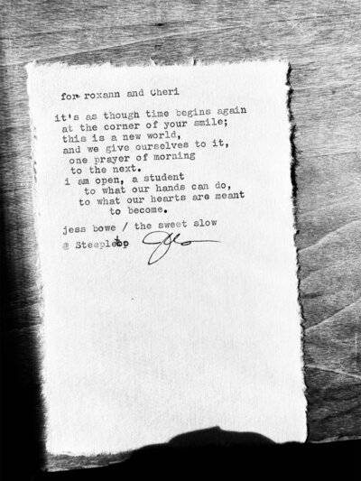 hey friend! i'm jess bowe, poet at The Sweet Slow (yes, my name rhymes with this Little Ole House of In-The-Moment-Poetry).
