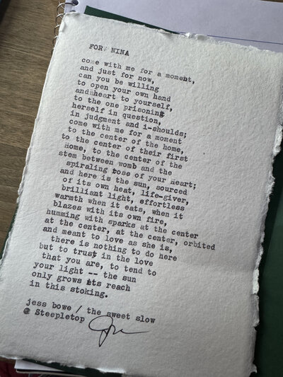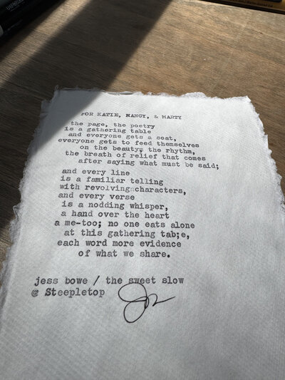 most of the time, guests don't necessarily know what they want their poems to be about, which is why it's so important to invite those who come to the table into gentle, curious conversation. i have a way of asking the right questions, listening to what isn't being spoken, and tuning into the feeling underneath the words.