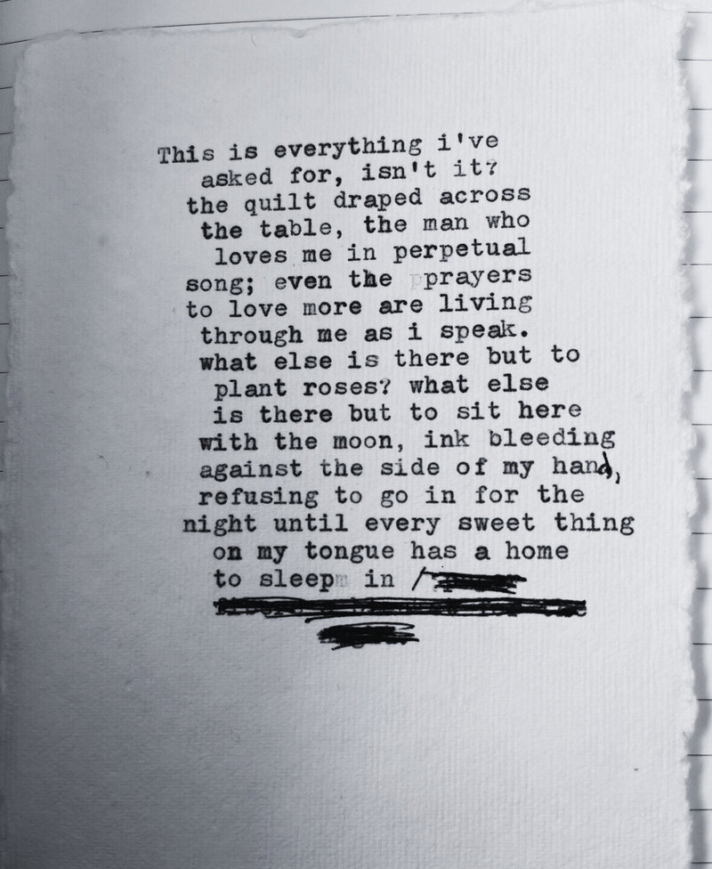from there, i'm gifted with an image, a phrase, or a word and i begin writing. as long as i trust that first spark, the poem almost writes itself through me.